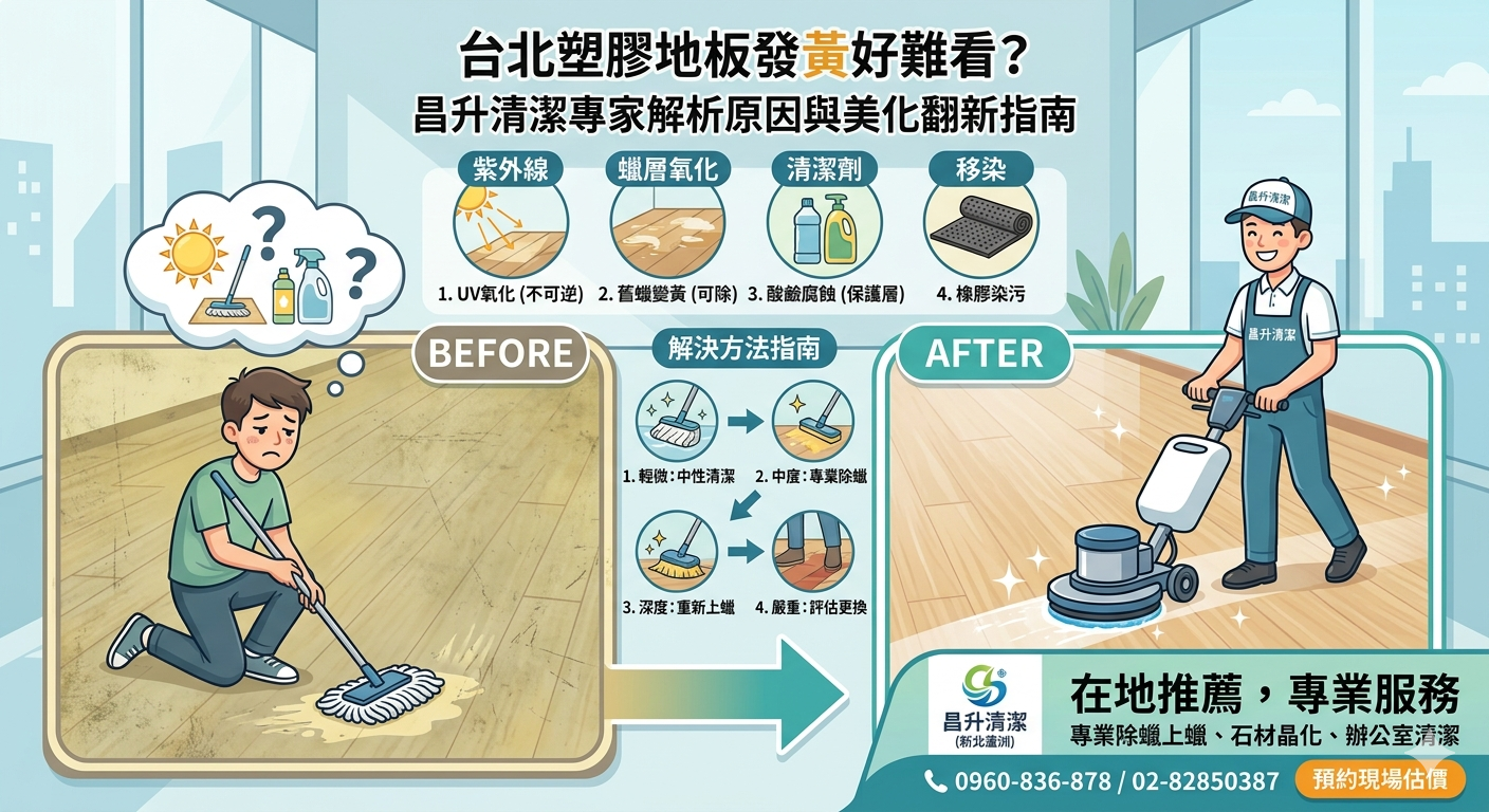 在台北濕氣重且建物密集的環境下,許多辦公室、店面或住家選用耐磨且花色多樣的塑膠地板(PVC 地板)。然而,使用一段時間後,原本清爽的地板顏色常會出現「發黃」、「變暗」的情況,即使天天拖地也擦不掉。